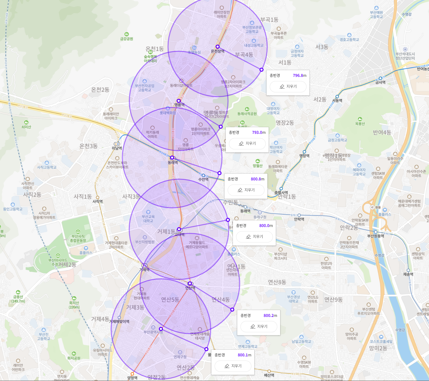 특히, 1호선 라인을 기준으로 잡아서 최대 800M 반경에 있는 아파트를 선별하였습니다.